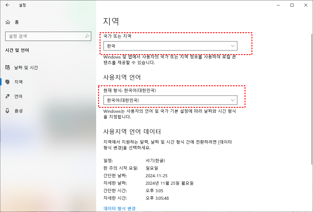 - 날짜 및 시간 형식: 한국어(대한민국)으로 설정