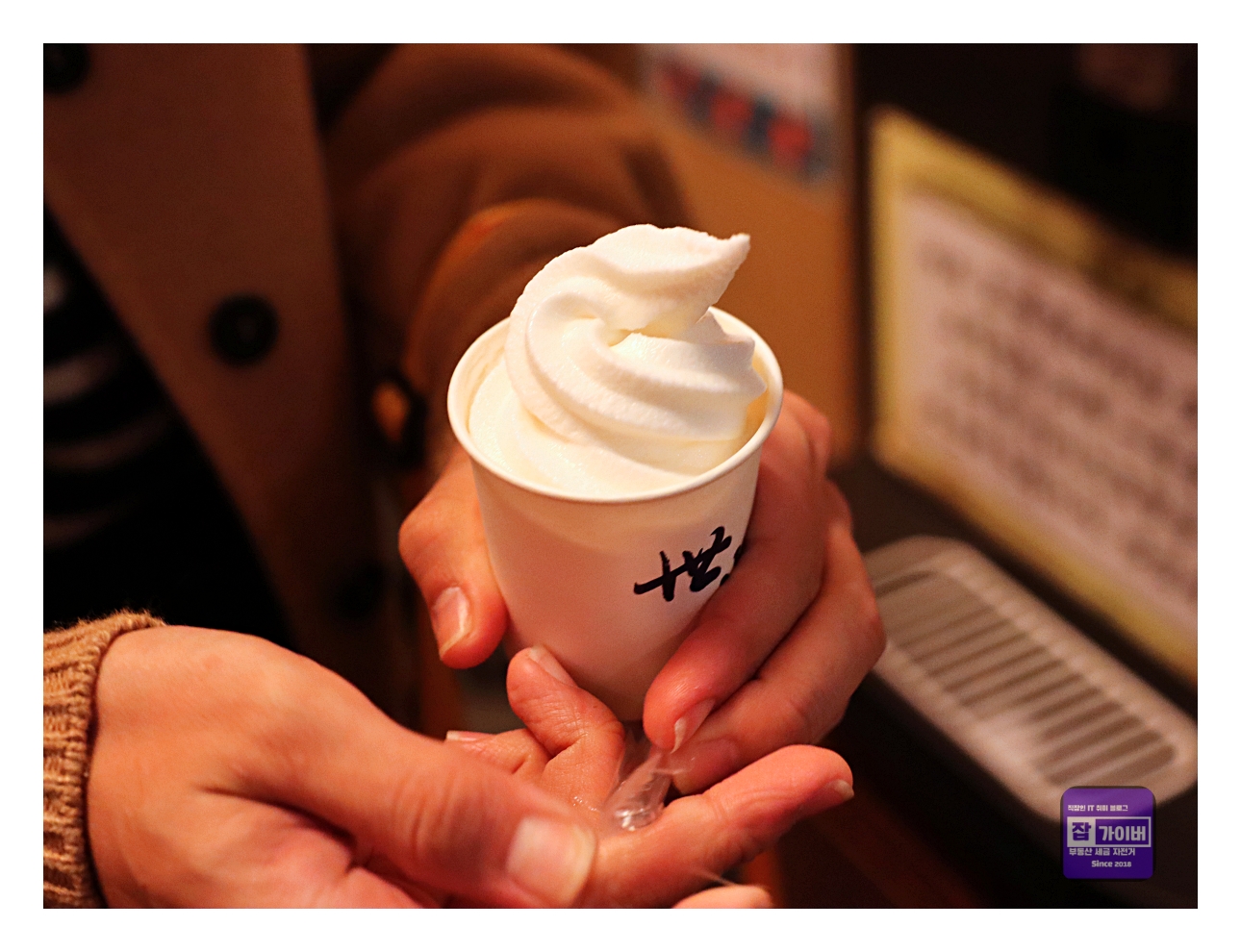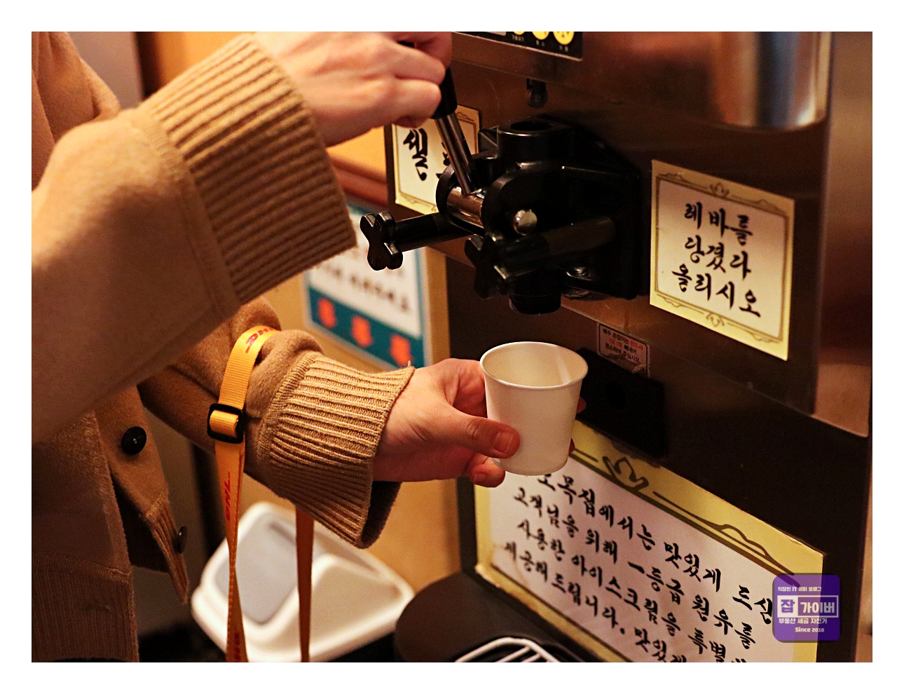 매운 족발을 먹고 맵찔이인 제가 혀를 호호 불고 있으니, 사장님께서 1등급 원유로 만든 아이스크림을 후식으로 권해 주셨어요.