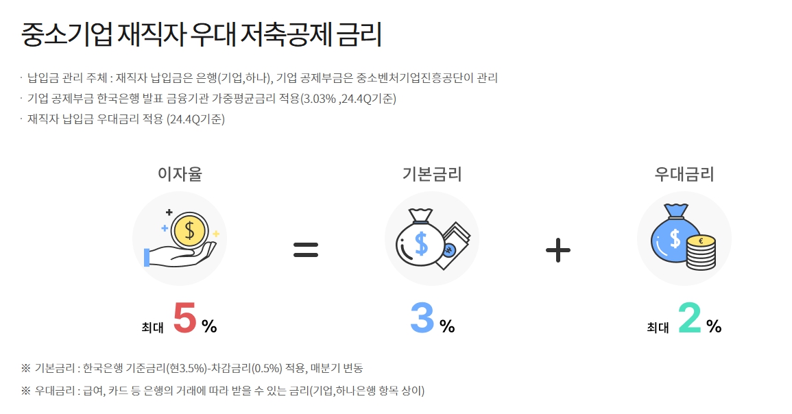 우선 이 상품은 기업의 지원금과 금융기관의 우대 금리를 통해 자산 형성을 돕는 제도이기 때문에 중소기업 우대 저축가입자의 소득 수준이나 다른 공공 지원 수급 여부와는 별개의 조건으로 운영됩니다.