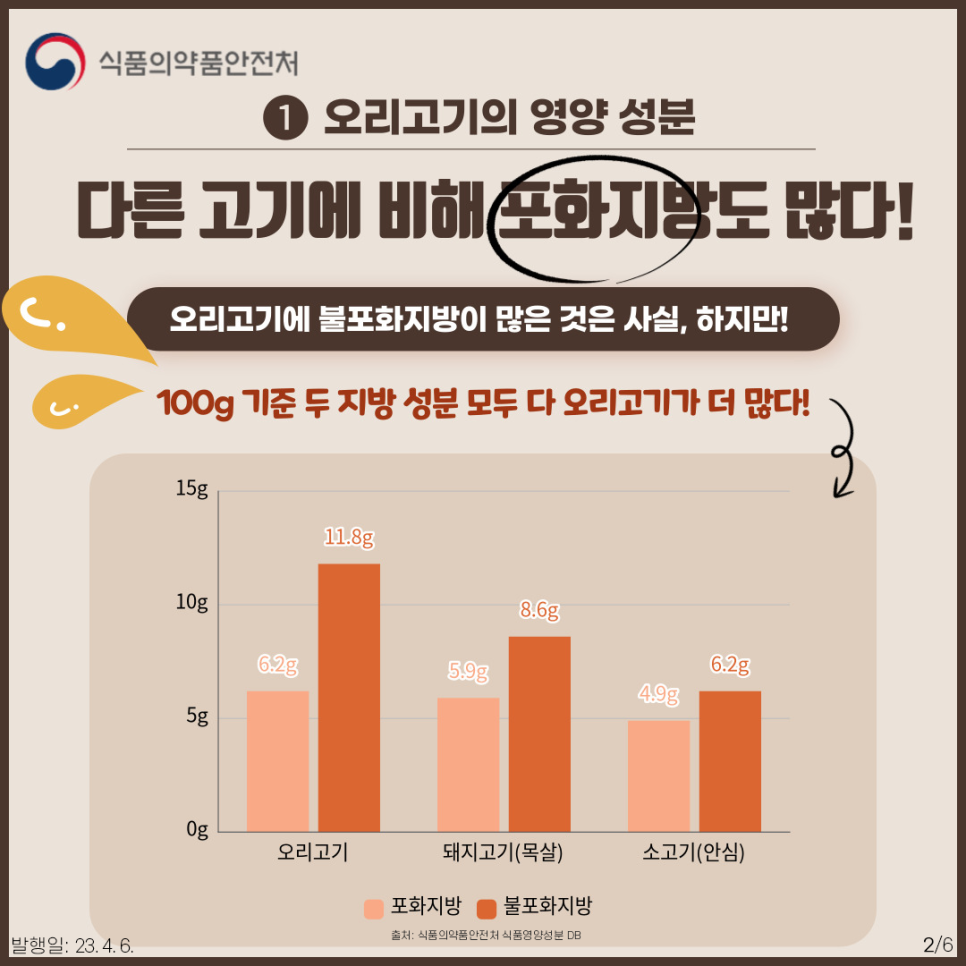 오리고기가 건강에 좋다는 주된 이유는 불포화지방 함량이 높기 때문입니다. 실제로 농촌진흥청의 자료에 따르면, 오리고기는 소고기나 돼지고기보다 불포화지방이 더 많습니다. 오리고기 100g에는 약 11.8g의 불포화지방이 포함되어 있어, 소고기(6.2g)와 돼지고기(8.6g)보다 높은 수치를 보입니다.