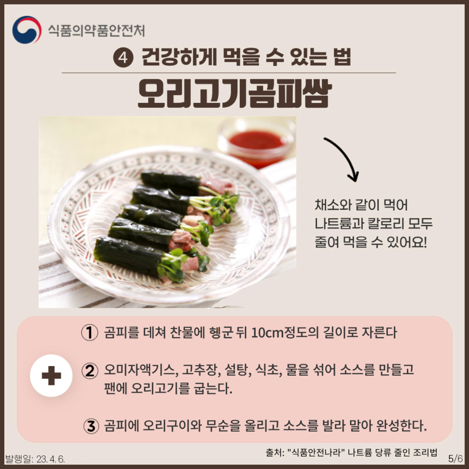 - 적정량 섭취하기: 오리고기는 불포화지방이 많지만, 과도하게 섭취하면 총 지방 섭취량이 늘어나 건강에 악영향을 미칠 수 있습니다. 적정량을 지켜 섭취하세요.