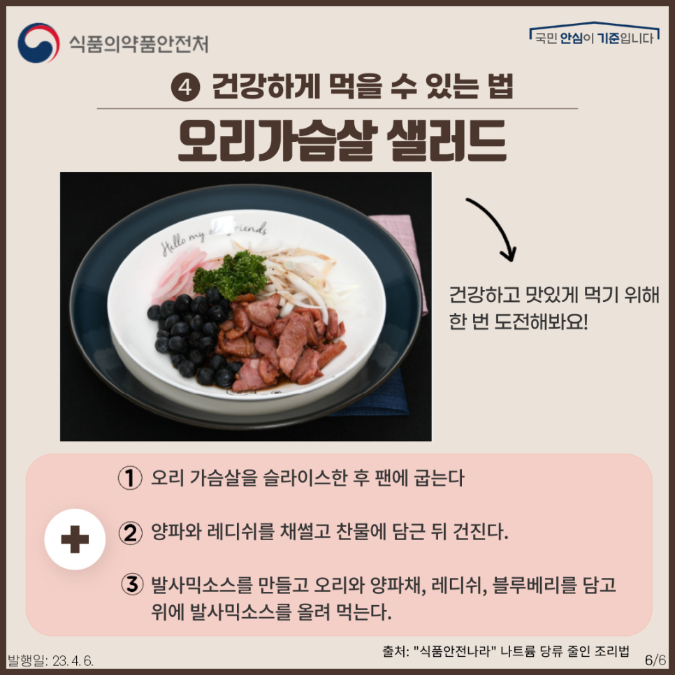 - 훈제 오리보다 생고기 선택: 시중에 판매되는 훈제 오리에는 아질산나트륨 같은 첨가물이 들어 있을 가능성이 높습니다. 첨가물은 조리 과정에서 니트로스아민으로 변환되어 혈당 조절과 관련된 문제를 일으킬 수 있습니다. 생고기를 구입해 직접 요리하는 것이 건강에 더 좋습니다.