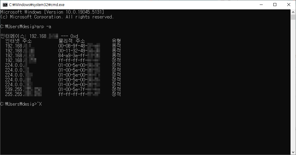 명령어 창에 arp -a를 입력하면, 현재 네트워크에 연결된 기기들의 IP 주소와 MAC 주소 (물리적주소)를 확인할 수 있으며 이때, 각 기기의 MAC 주소를 확인하고, 해당 MAC 주소에 맞는 IP 주소를 찾을 수 있습니다.