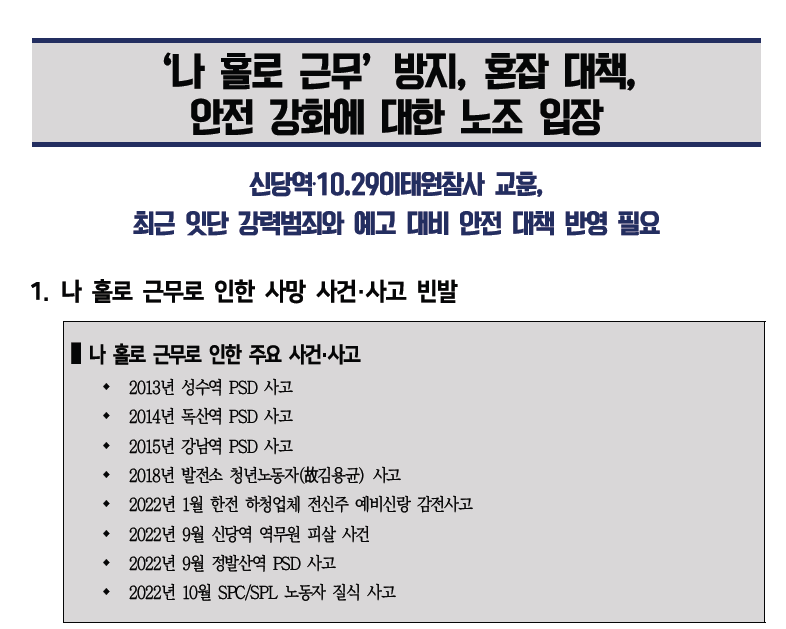예시 2: 신당역 사건과 안전 문제 2022년 신당역 사건은 역무원의 안전이 얼마나 취약한지 보여주는 사례입니다. 노조는 이와 같은 비극적인 사건을 방지하려면 더 많은 인력이 필요하다고 강조하며, 안전 문제를 이유로 인력 감축을 반대하고 있습니다.