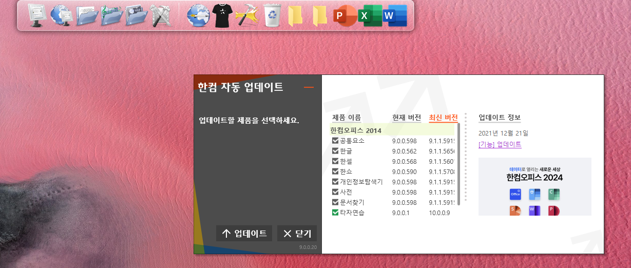 업데이트 항목 중 hwpx 호환성 업데이트나 보안 관련 업데이트가 포함되어 있는지 확인합니다.