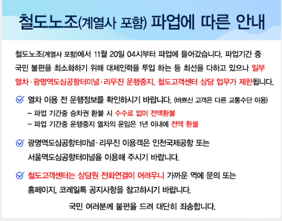 11월 18일부터 시작된 코레일 준법투쟁으로 인해 수도권 전철 운행이 축소되고 지연 사태가 이어지고 있습니다.