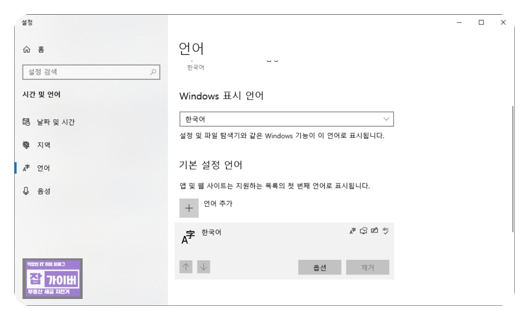 - 제어판을 열고, 시간 및 언어 > 언어로 이동합니다.