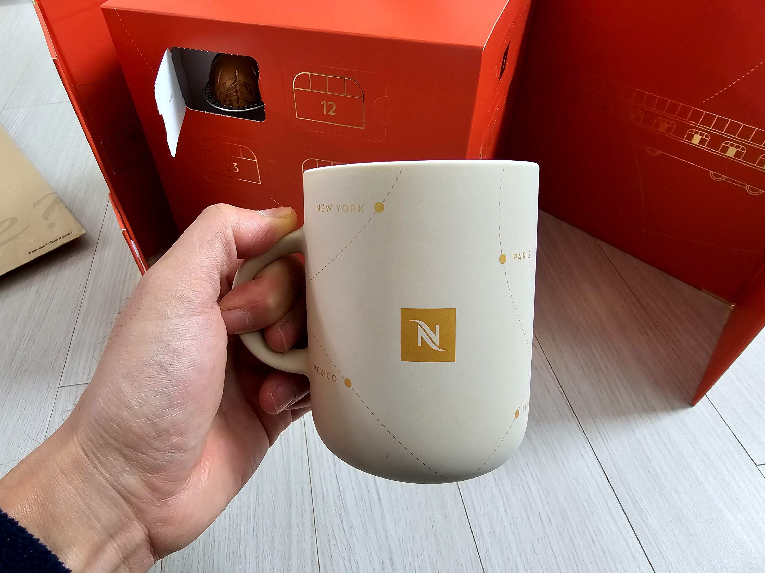 가장 큰 칸(24번)을 열었을 때 나오는 머그잔은 네스프레소의 골드 디테일이 돋보이는 디자인으로, 보는 것만으로도 기분이 좋아졌습니다.