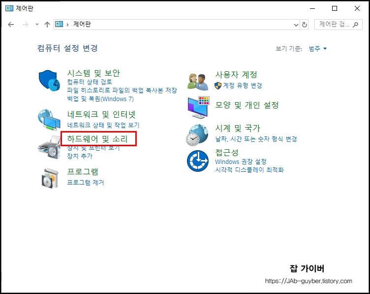 윈도우키 - 제어판 - 하드웨어 및 소리로 들어갑니다. (윈도우 11에서는 시작 메뉴에서 “제어판” 검색이 가장 빠릅니다.)