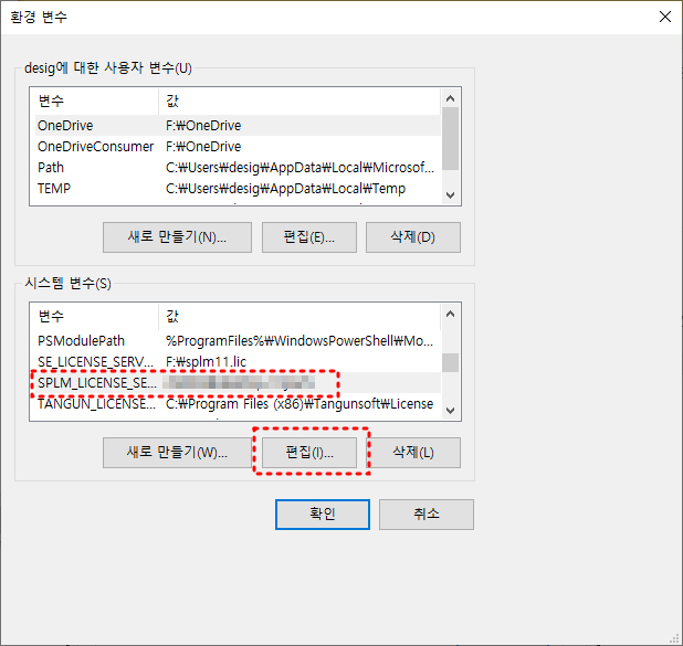 - 변수 값 확인: 28000@host name 또는 28000@[IP Address] 형식이어야 하며, NX License Server PC의 Host Name 또는 IP Address를 입력.