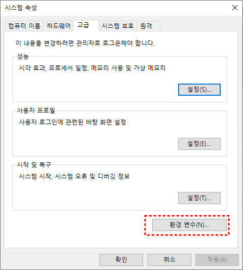 - 내 컴퓨터 → 속성 → 고급 시스템 설정 → 환경 변수 → 시스템 변수.
