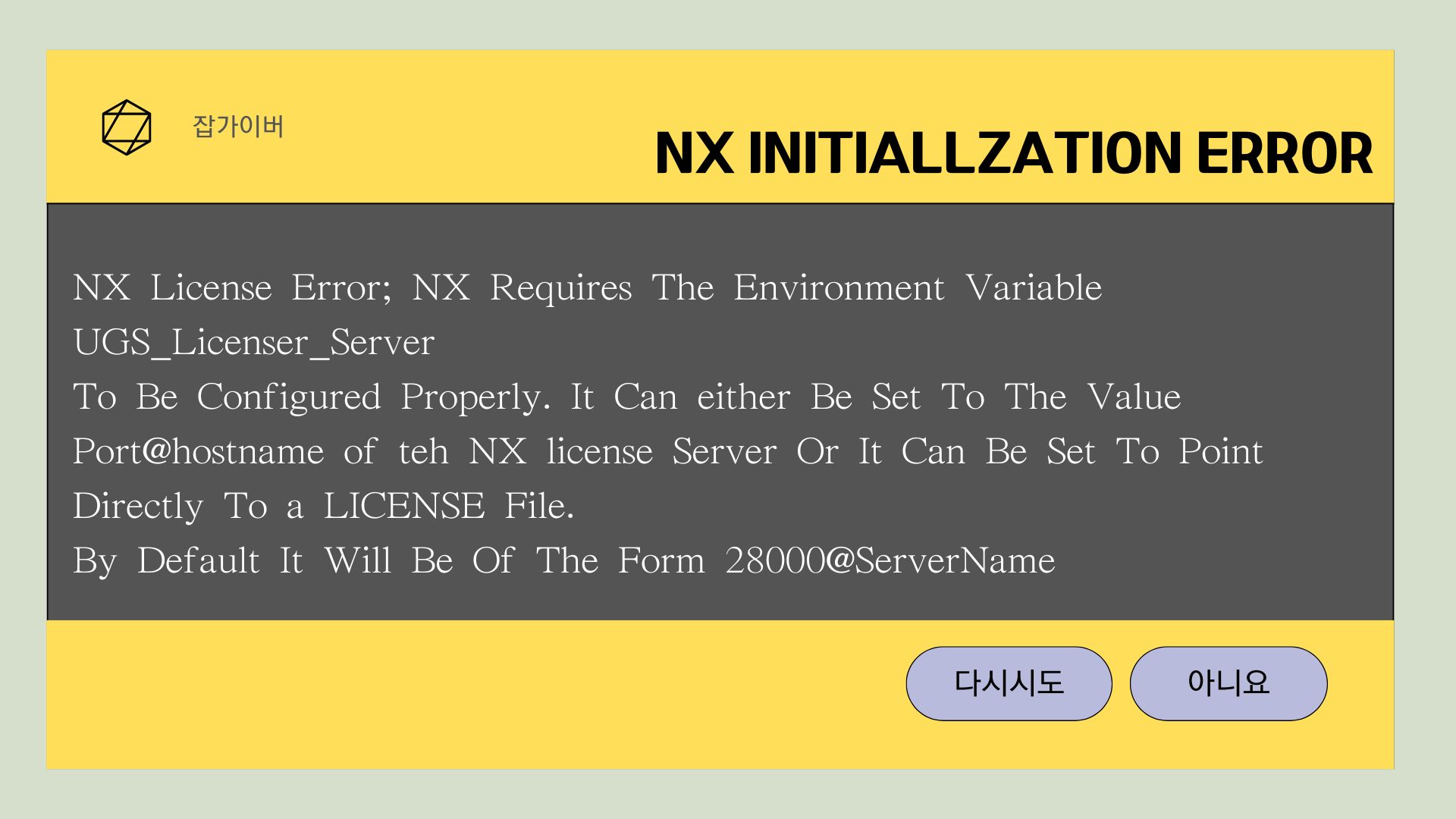 원인 : Client PC가 라이센스 서버와의 연결에 실패하거나 환경 변수 설정이 올바르지 않을 때 발생합니다. 참고로 NX2306 이상 버전을 사용한다면 Port가 28000이 아니라 29000번일 수 있으니 이것도 확인해야합니다.