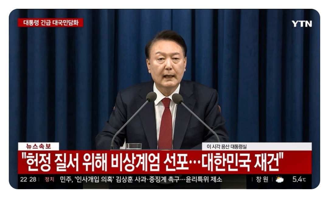 2024년 12월 3일 밤, 윤석열 대통령은 북한 위협과 국내 정치 혼란을 이유로 비상계엄을 선포했습니다.