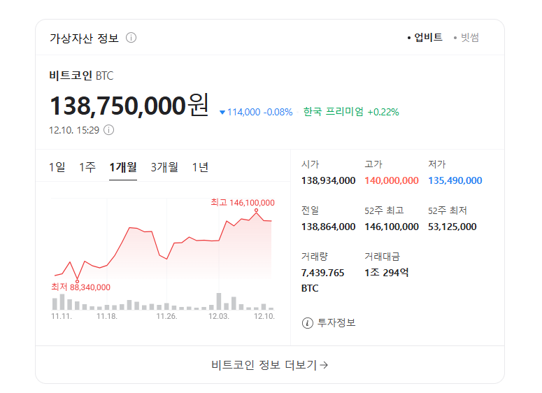 예를 들어 2024년 12월 4일 오전 11시 기준, 코인마켓캡에 따르면 비트코인은 해외에서 1억 3,570만 원, 국내 업비트에서는 1억 3,465만 원에 거래되었습니다.