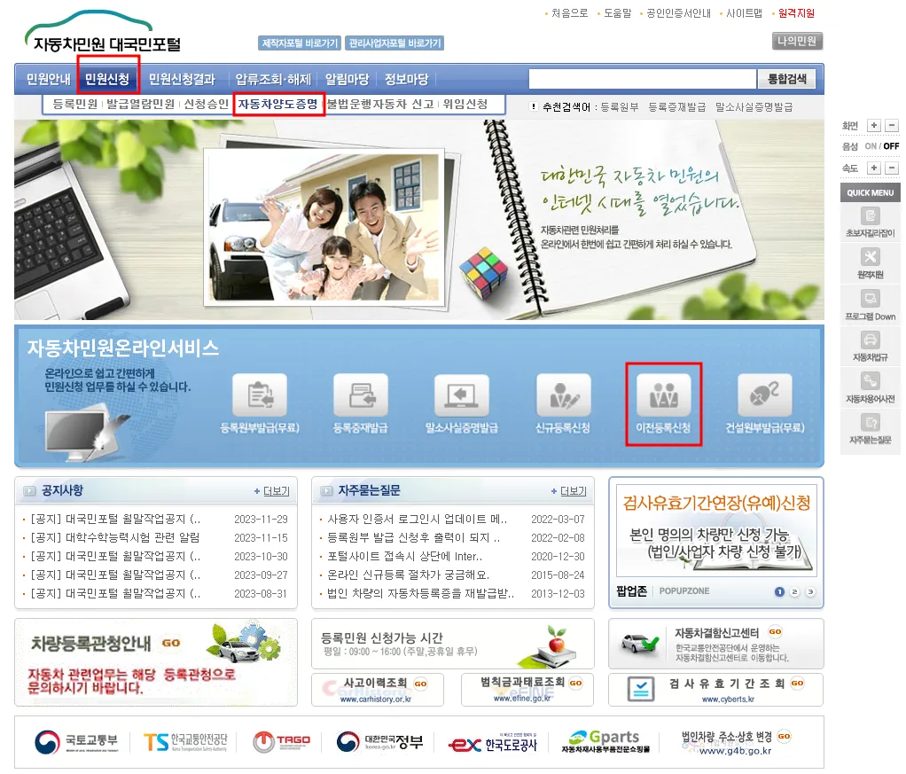 자동차민원 대국민포털에서 공인인증서를 통해 간단히 명의이전을 진행할 수 있습니다.