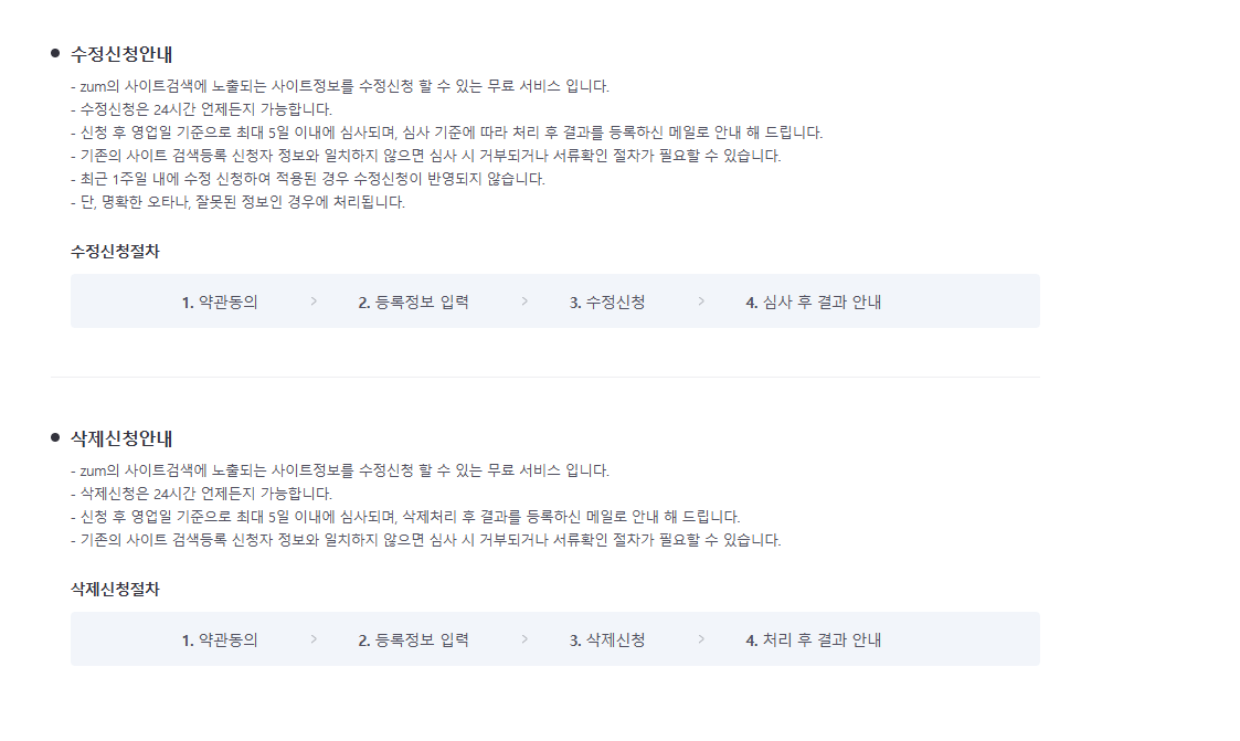 ZUM 사이트 검색에 노출되는것은 무료이며 신청 후 최대 5일 뒤 검사가 안료되며 1주일 이내라면 수정이 가능합니다.