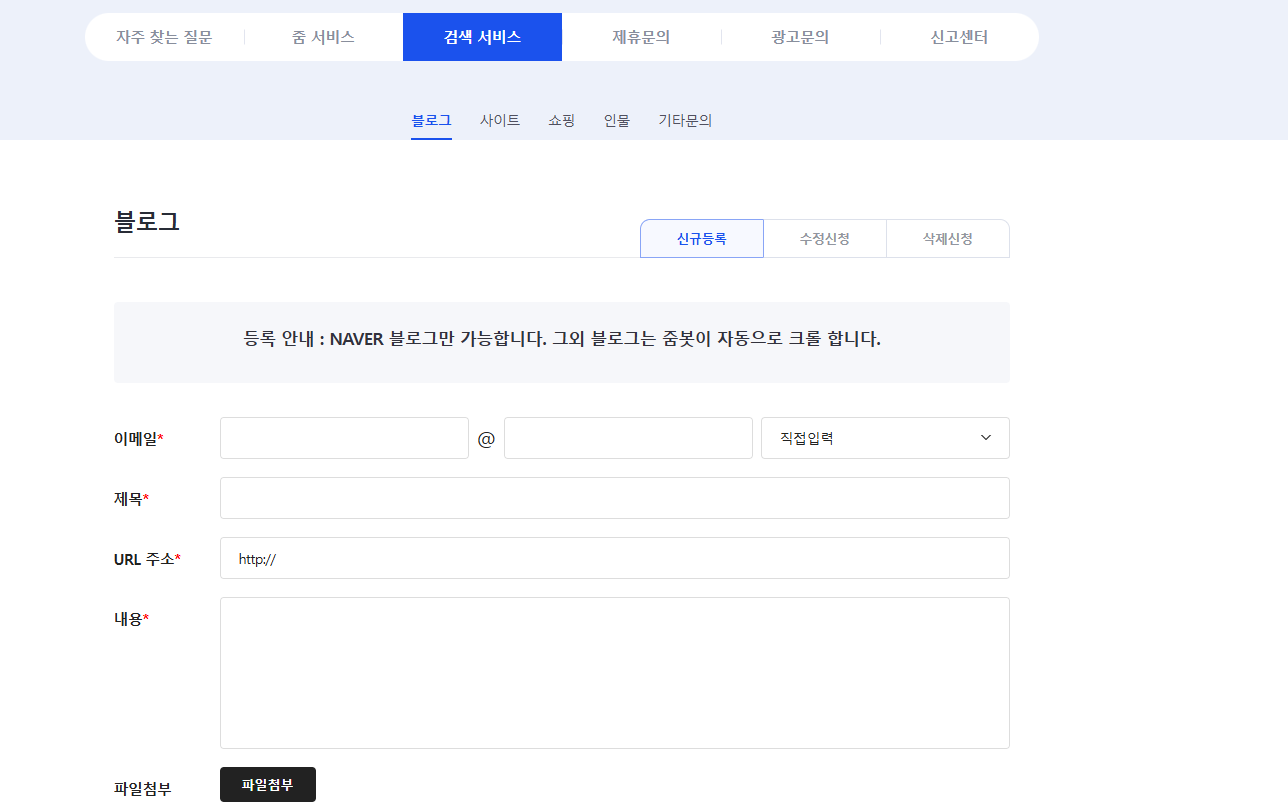단 여기에는 블로그는 등록이 불가능하며 그 외 쇼핑몰을 운영한다면 별도의 쇼핑몰탭을 이용하면 됩니다.