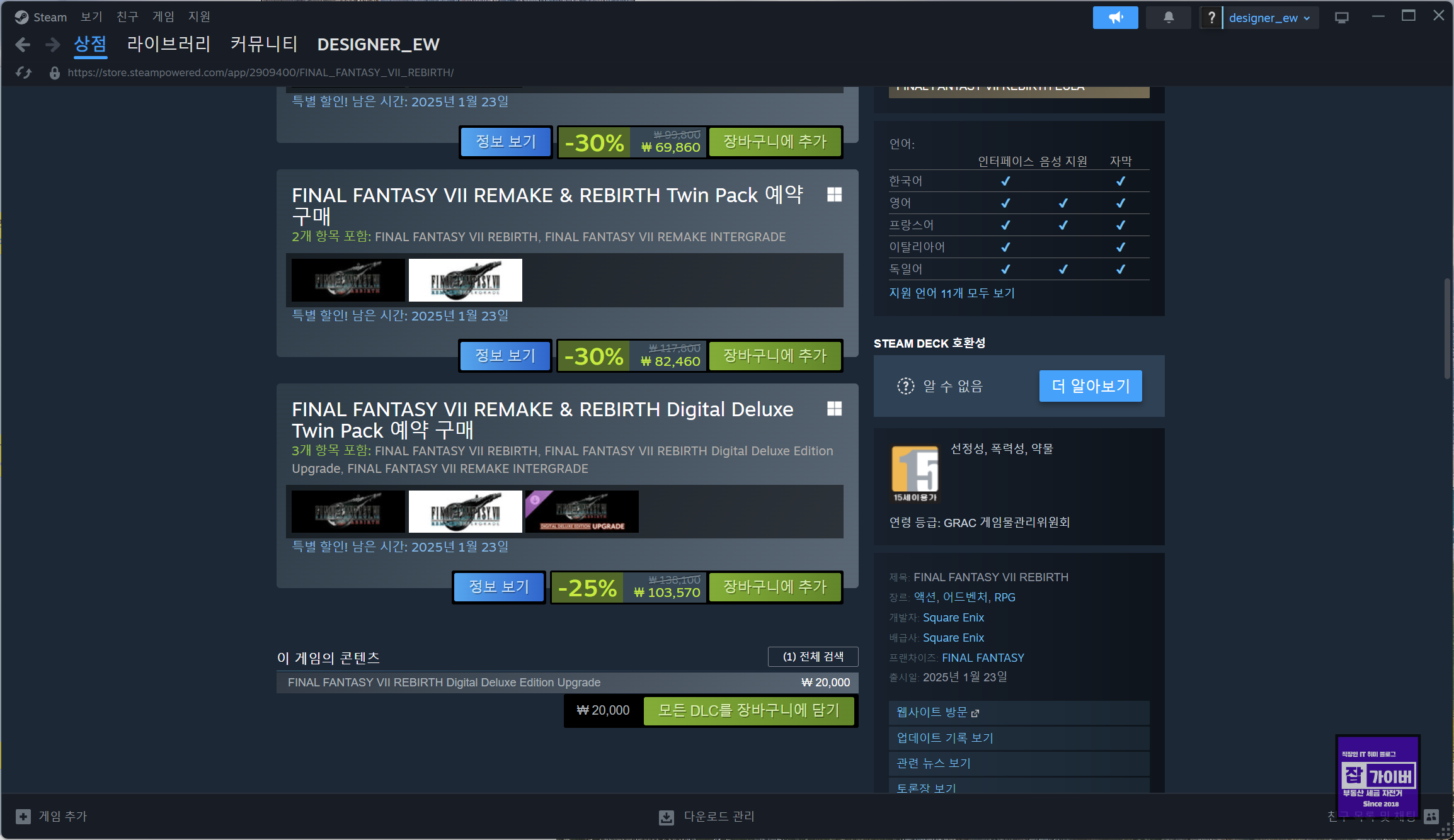 파이널판타지7 리버스 PC버전 출시 30% 할인 예약구입 후기