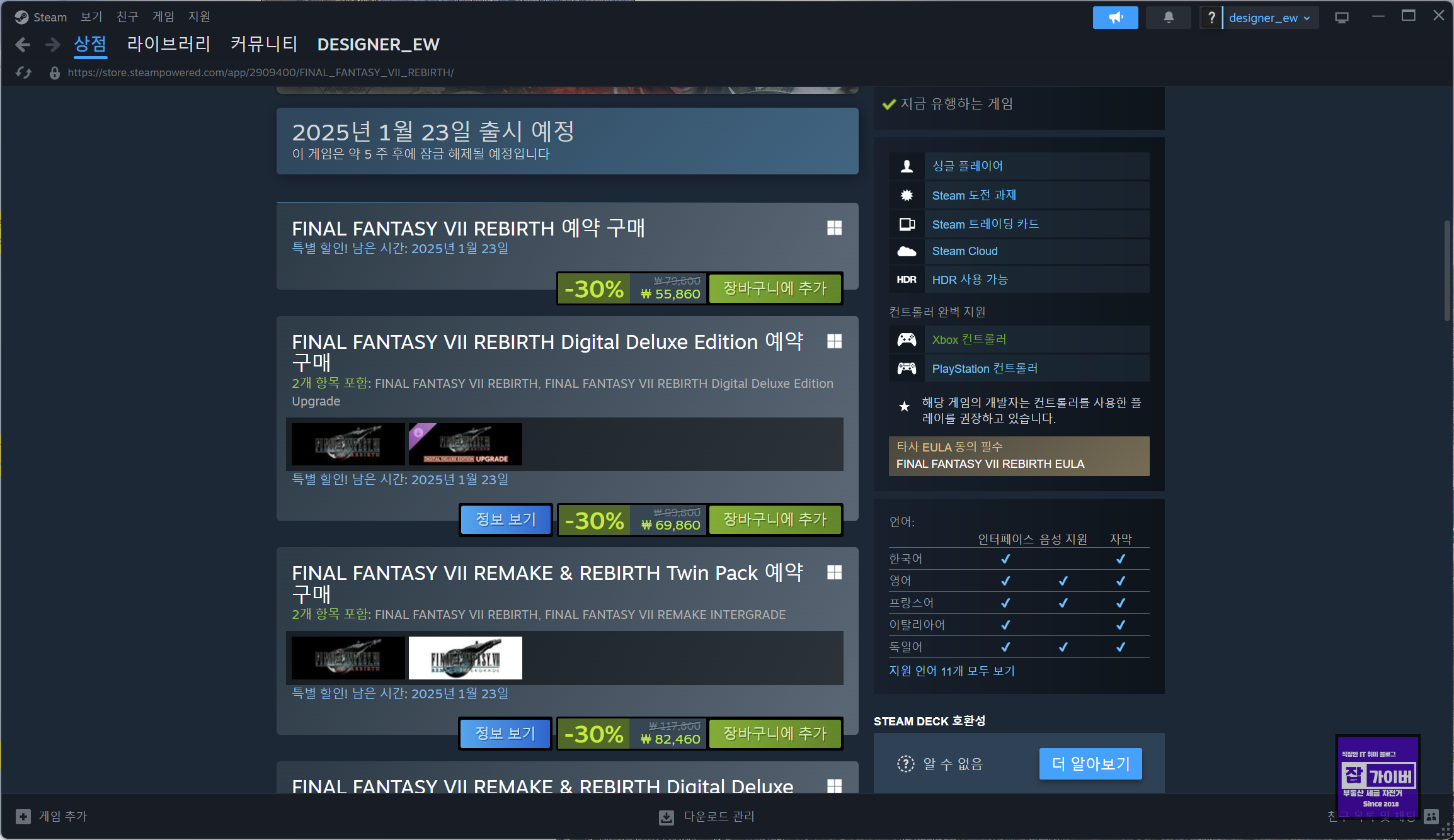 파이널판타지7 리버스 PC버전 출시 30% 할인 예약구입 후기