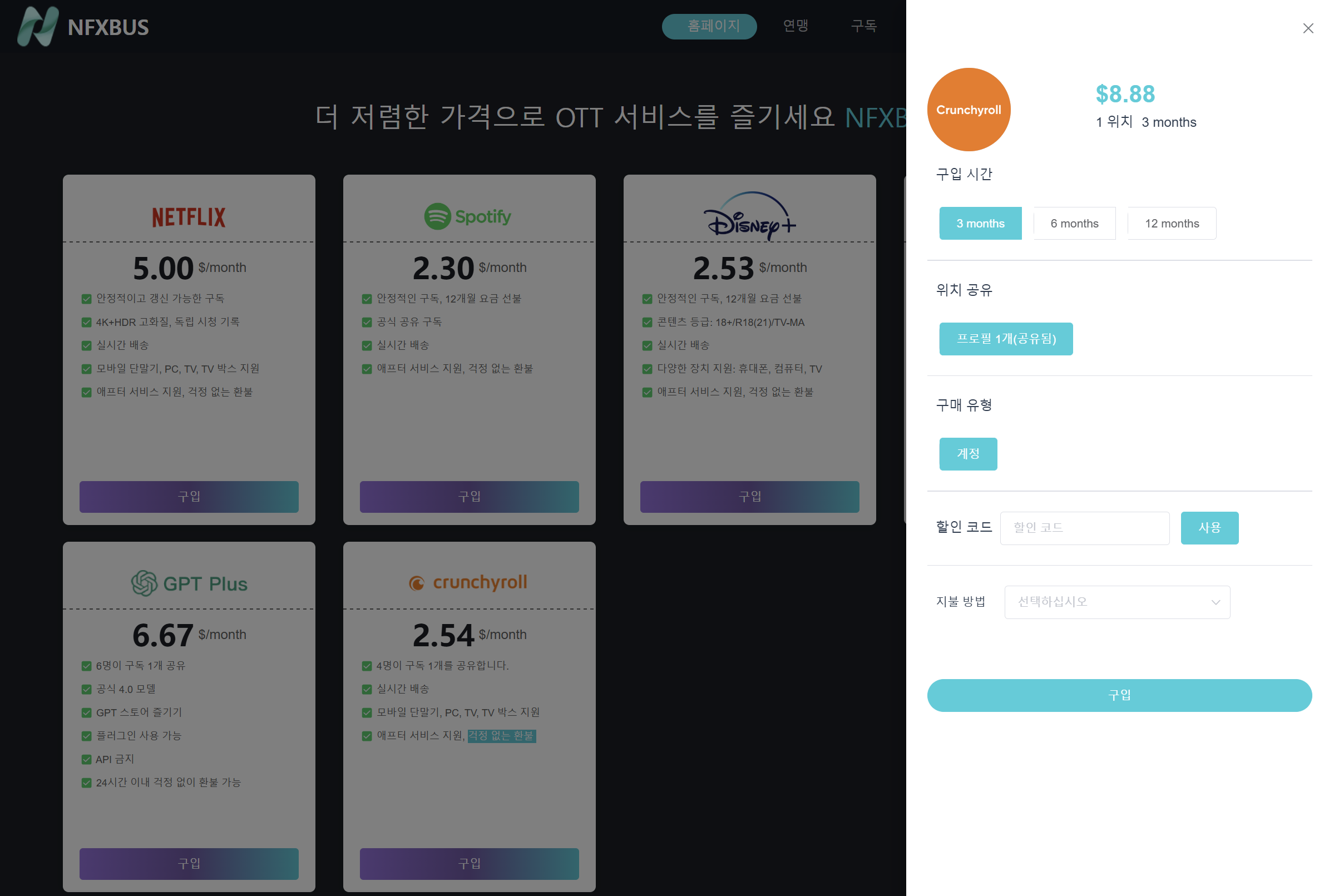 NFXBUS는 크런치롤을 포함한 다양한 OTT 서비스를 저렴하게 제공하는 플랫폼입니다.