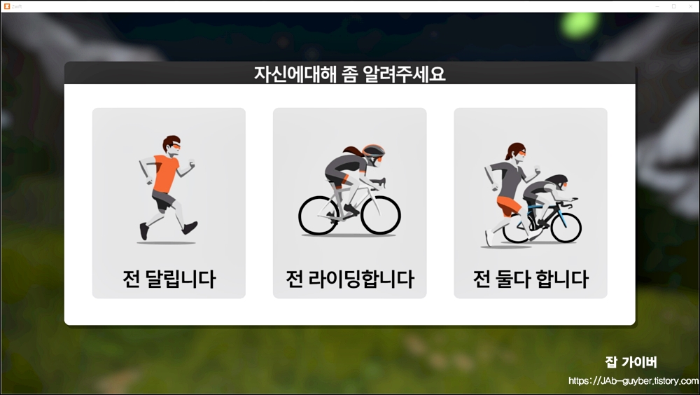 즈위프트는 런과 라이딩 두 가지를 지원하며 운동 종류를 선택합니다.