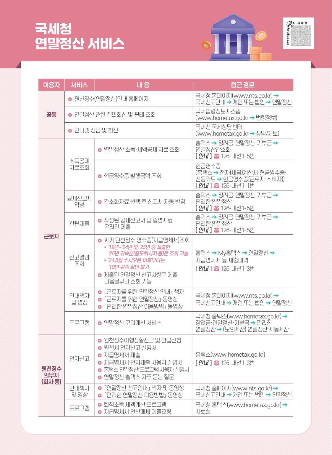 - 국세청 홈택스에서 ‘연말정산 간소화 서비스’를 통해 소득·세액공제 자료를 조회하세요.