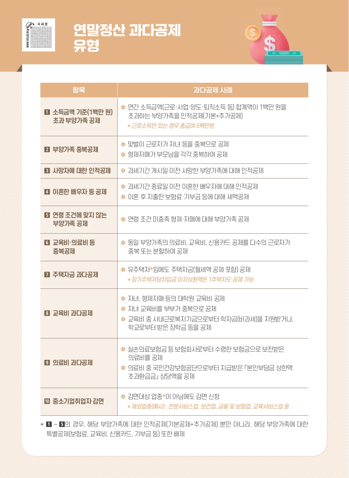 - 맞벌이 부부는 부양가족 공제를 중복 신청하지 않도록 주의하세요. 가산세가 부과될 수 있습니다.