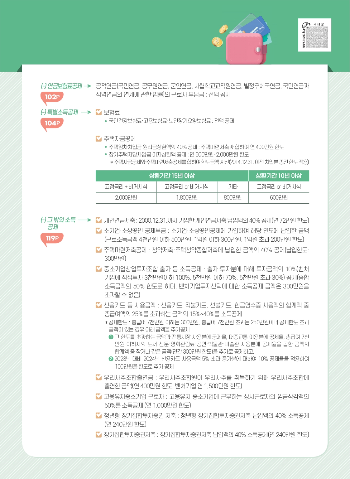 - 장기주택저당차입금 공제 한도: 기존 300만~1800만 원의 공제 한도가 600만~2000만 원으로 상향되었습니다.