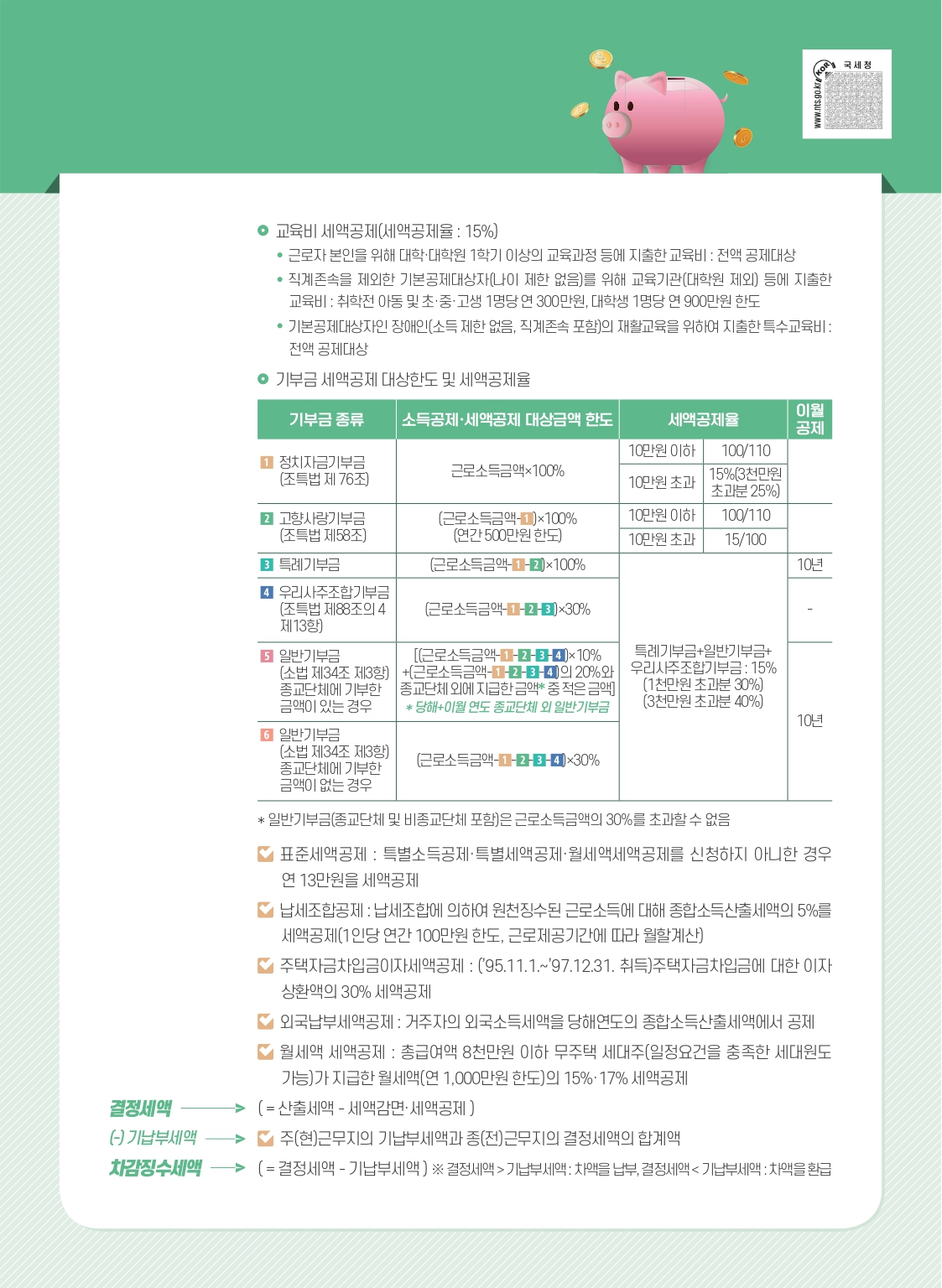 | 기부금 공제 | 일정 금액 이상 기부 시 15~40% 공제. |