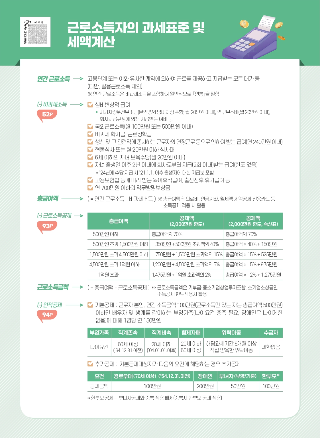 | 부양가족 공제 | 기본공제 대상자 1인당 150만 원 공제(소득 요건 충족 시). |