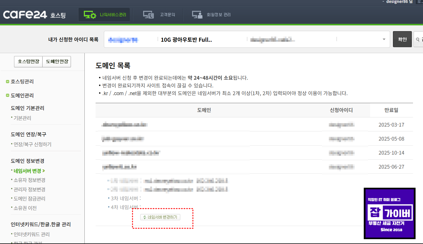 저 같은 경우 호스팅은 블루호스트 도메인은 카페24에서 사용하고 있기 때문에 네임서버주소를 카페24에서 변경해야합니다.
