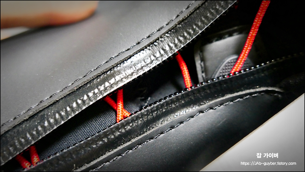 참 간단할 수 있지만 단점이 있으니 가장 첫번재로 끈이 지퍼를 올리면서 마찰을 일으켜 노후화가 금방 일어납니다.