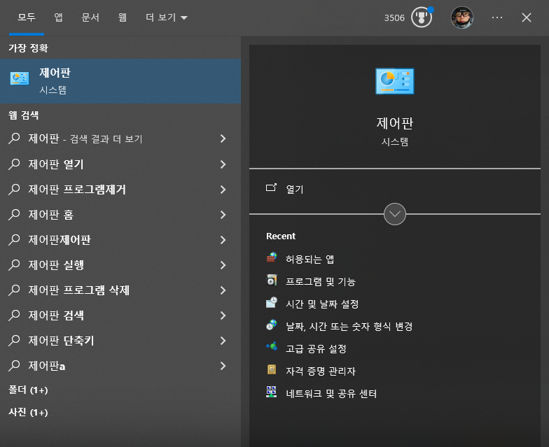 검색창에 '제어판'을 입력하고 검색 결과에서 제어판을 클릭 우측 상단에서 '보기 기준'을 '작은 아이콘'으로 변경합니다.