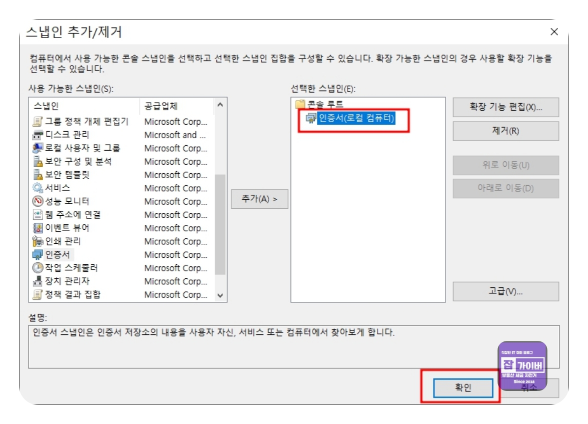 인증서 항목을 선택 후 추가를 눌러준 뒤 컴퓨터 계정을 선택합니다.