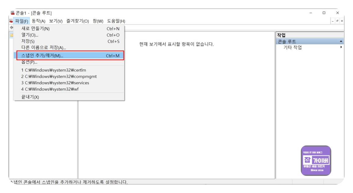콘솔이 실행되면 스냅인 추가를 선택합니다.