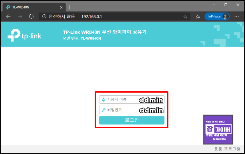 공유기의 관리 페이지가 열리면, 기본적으로 설정된 관리자 계정 이름(일반적으로 admin)과 비밀번호(또한 admin이 될 수 있음)를 입력합니다.