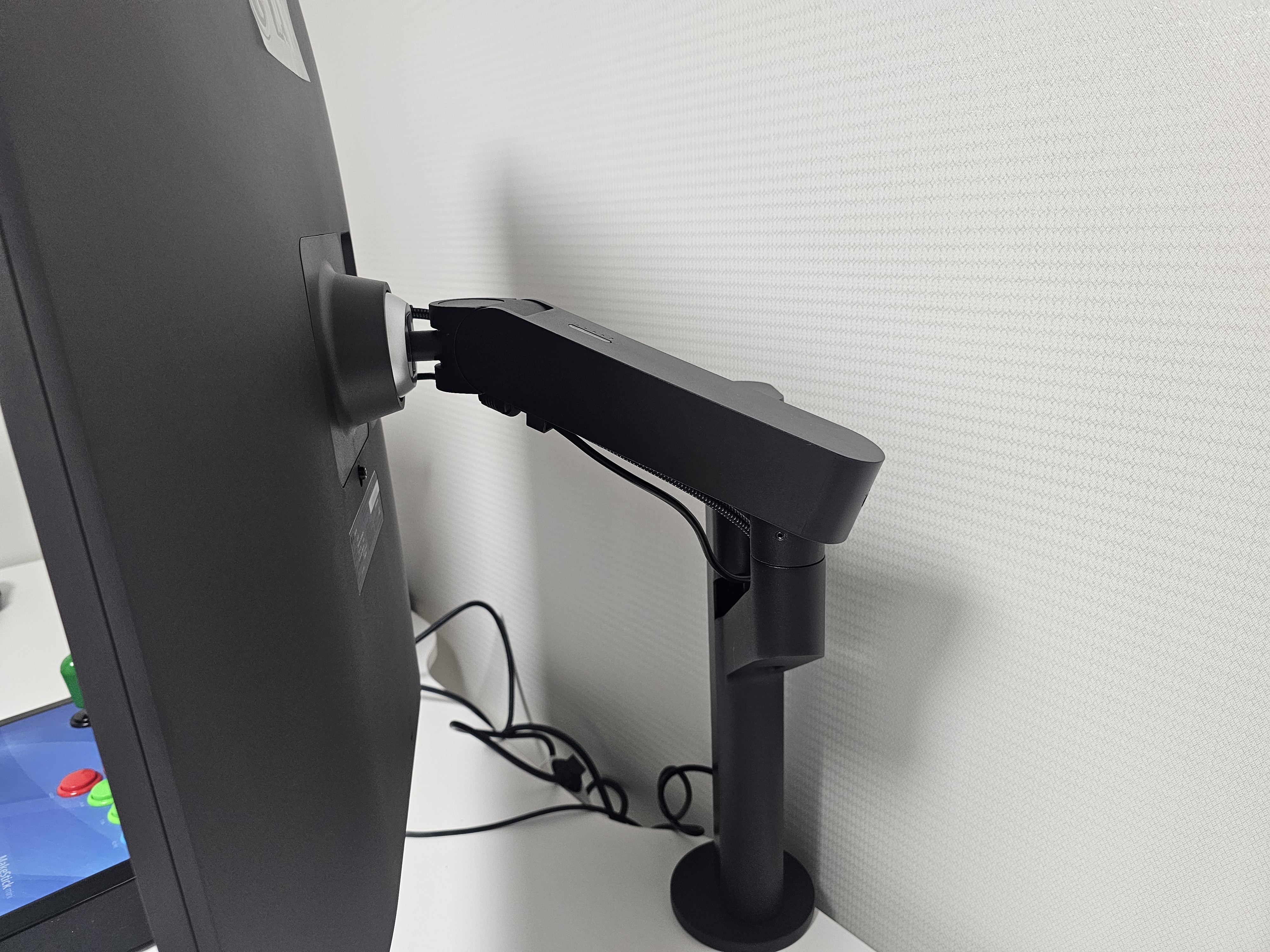 하지만 저는 기본 스탠드 대신 별도의 흰색의 싱글 모니터암을 선택하여 더 깔끔하고 세련된 셋업을 완성했습니다.