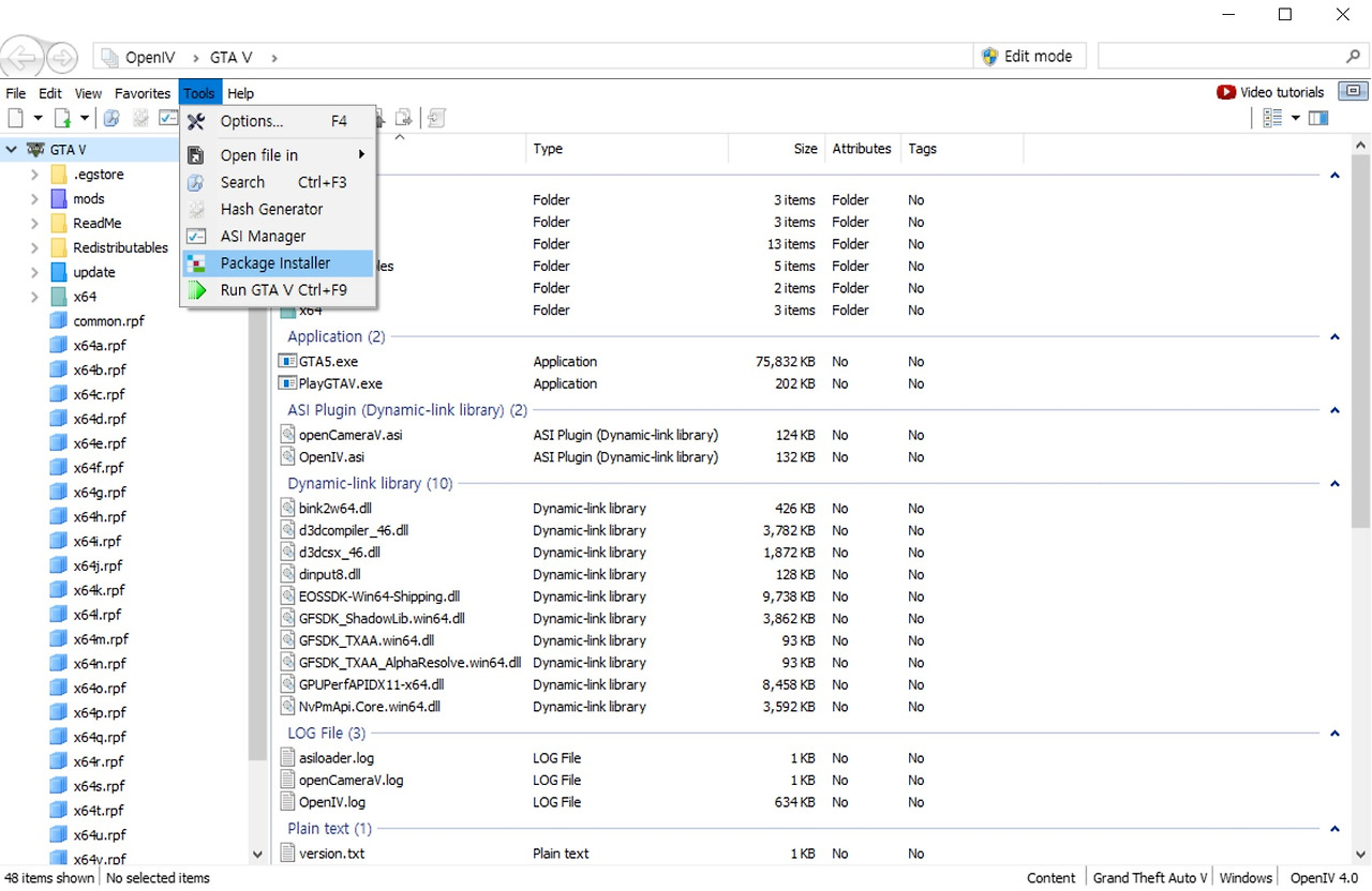OpenIV 상단 메뉴에서 Tools → ASI Manager로 들어가 필요한 항목을 설치합니다.