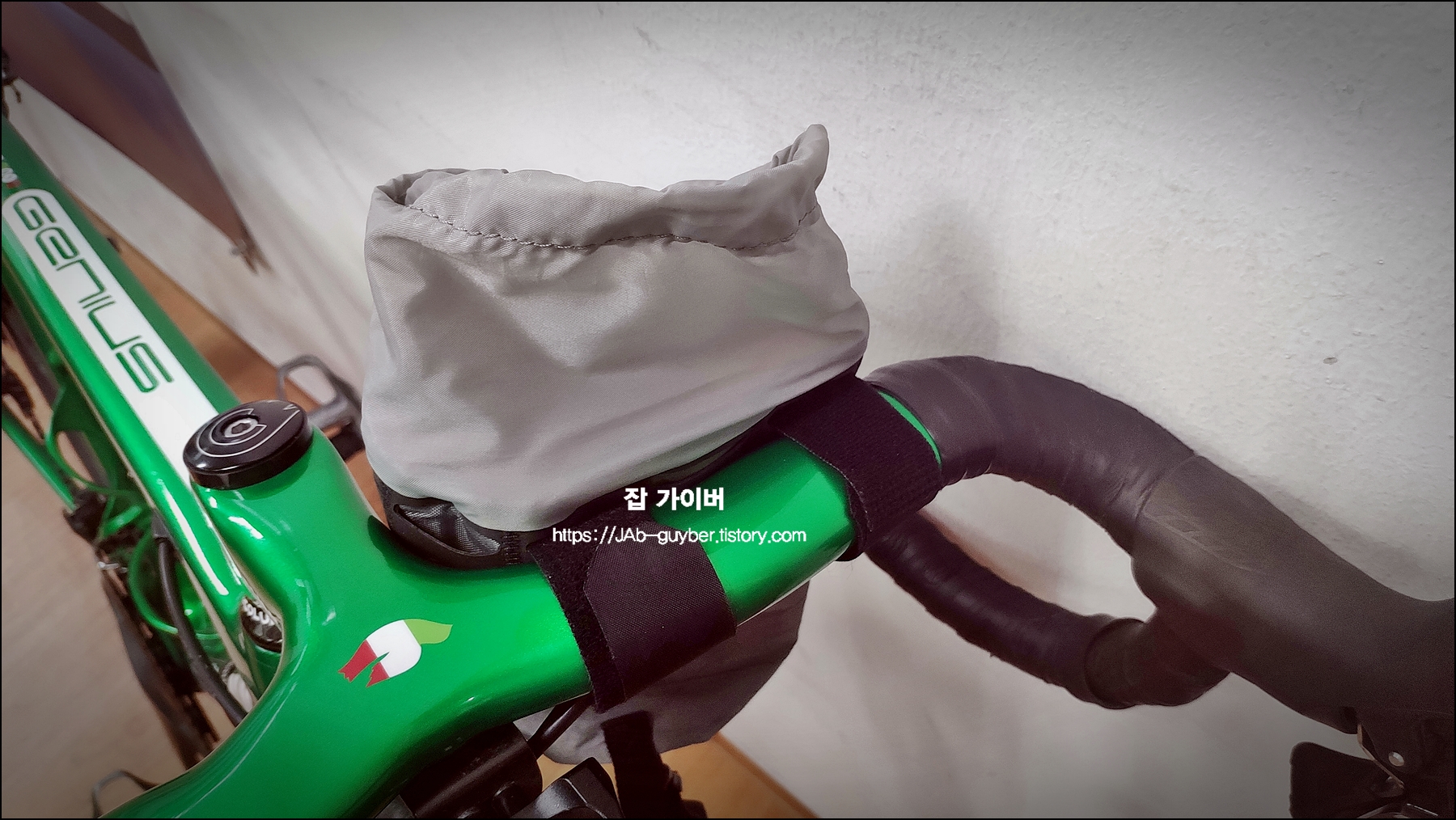 기본적으로 드롭바에는 2개의 찍찍이로 고정하는 형태로서 에어로 핸들바에도 장착할 수 있는 사이즈입니다.