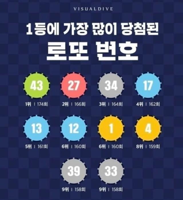 로또 6/45의 1회차(2002년 12월 7일)부터 1145회차(2024년 11월 9일)까지의 당첨번호를 분석한 결과, 가장 많이 출현한 번호로 로또 1등이 가장 많이 나온 번호는 위 표를 참고하세요