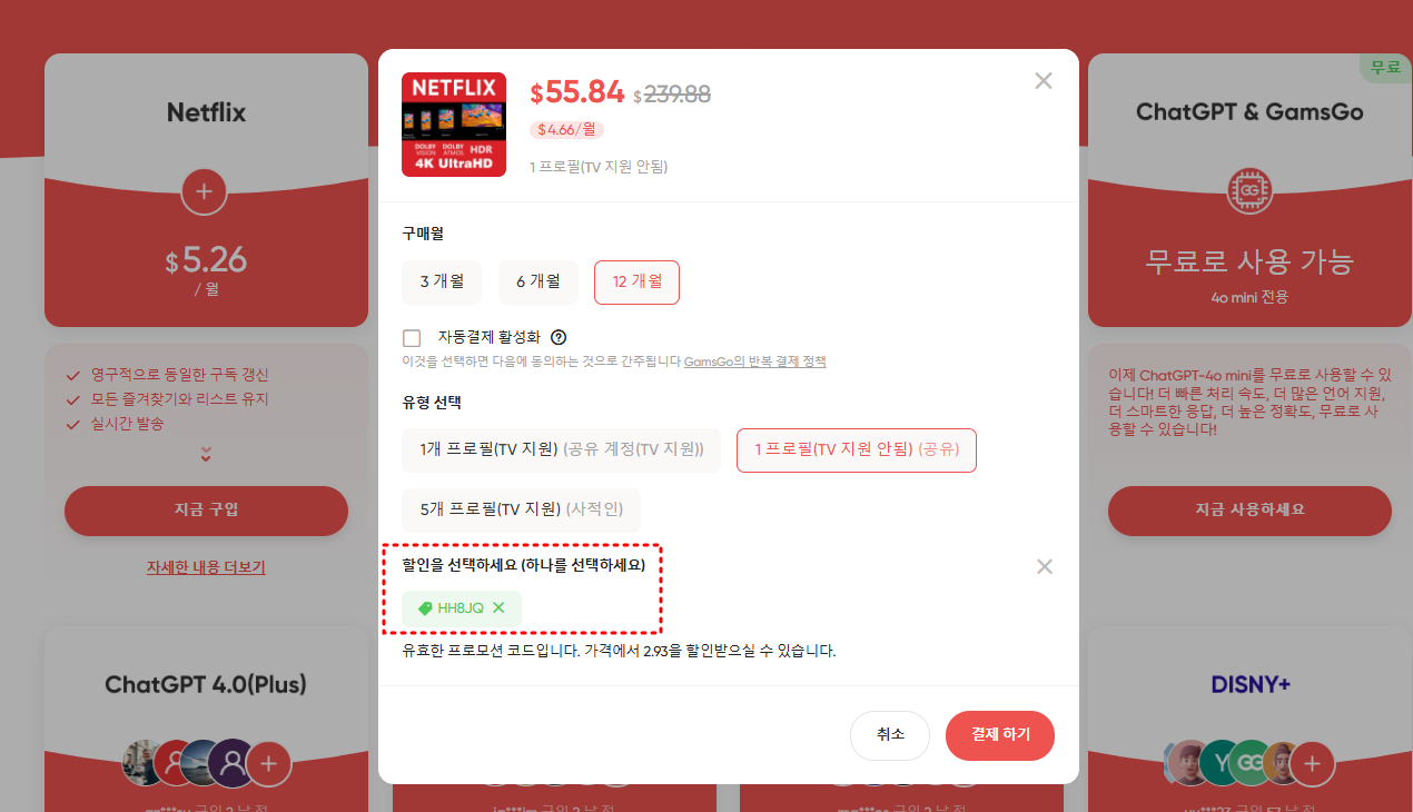 여기에서 겜스고의 가족공유 시스템으로 저 같은 경우 2년 째 넷플릭스 뿐만 아니라 유튜브 프리미엄과 CHATGPT를 함께 사용하고 있습니다.