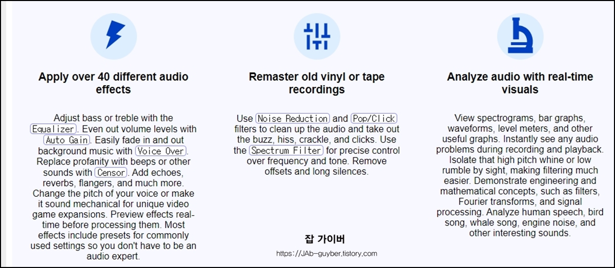 잡음 제거, 팝/클릭 감소, EQ로 대역 정리, 간단한 리버브/에코 같은 효과를 쉽게 적용할 수 있어요. 여기서 중요한 건 한 번에 과하게 밀어붙이기보다, 적당히 여러 번이 결과가 더 깔끔하게 나오는 경우가 많다는 점입니다. 특히 노이즈 리덕션은 강도를 올릴수록 “소리의 질감”도 같이 깎이기 쉬워요.