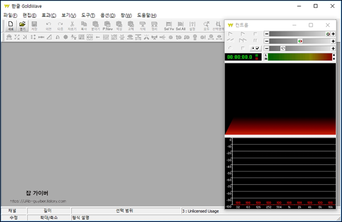 이상 골드웨이브 설치가 완료되어 실행되었으며 간단한 컨트롤 창 기능으로 내가 원하는 음악을 편집하거나 수정 보안할 수 있습니다.