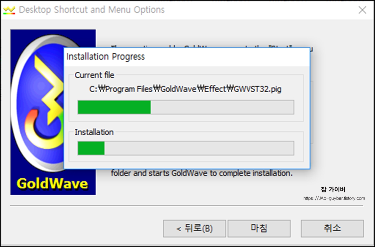 GoldWave.exe 파일을 실행하면 설치가 진행됩니다. 설치 위치나 바로가기 아이콘 여부 같은 건 PC 환경에 맞게 선택하면 되고, 설치 후 실행 체크를 켜두면 바로 프로그램이 열립니다.