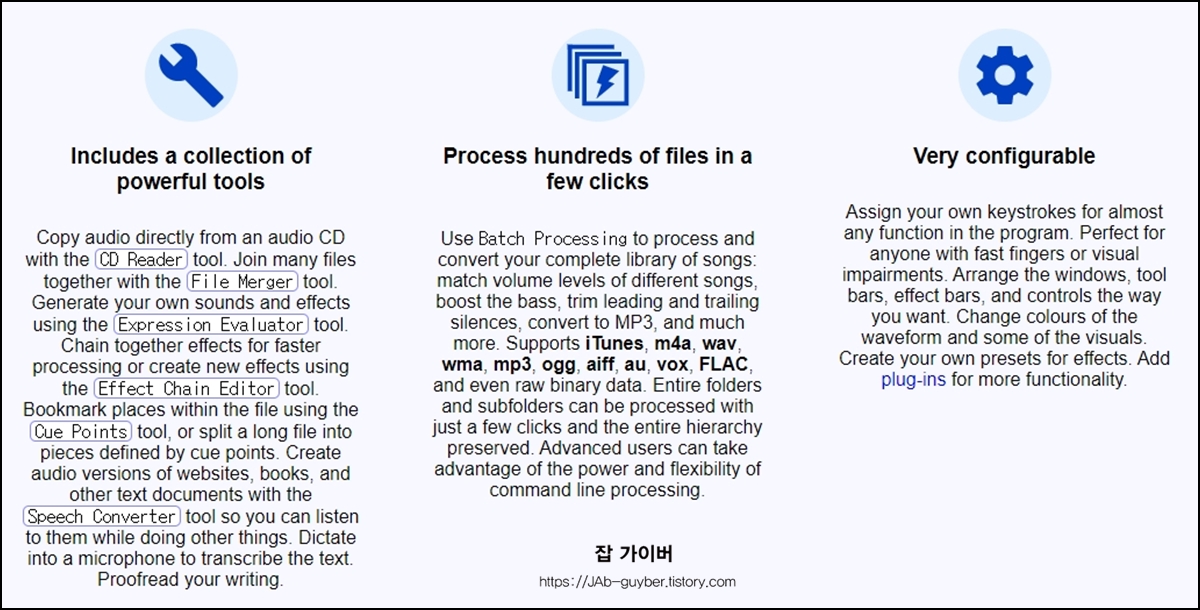 CD Reader도구를 사용하여 오디오 CD에서 직접 오디오를 복사하십시오.File Merger도구 와 함께 많은 파일을 결합하십시오.Expression Evaluator도구를 사용하여 나만의 사운드와 효과를 생성하십시오.빠른 처리를 위해 효과를 연결하거나 Effect Chain Editor도구를 사용하여 새로운 효과를 만듭니다.Cue Points도구를 사용하여 파일 내의 위치를 책갈피로 지정하거나 긴 파일을 큐 포인트로 정의된 조각으로 분할하십시오. Speech Converter도구를 사용하여 웹 사이트, 서적 및 기타 텍스트 문서의 오디오 버전을 만들어 다른 작업을 수행하면서들을 수 있습니다. 마이크를 사용하여 텍스트를 녹음하십시오. 글을 교정하십시오