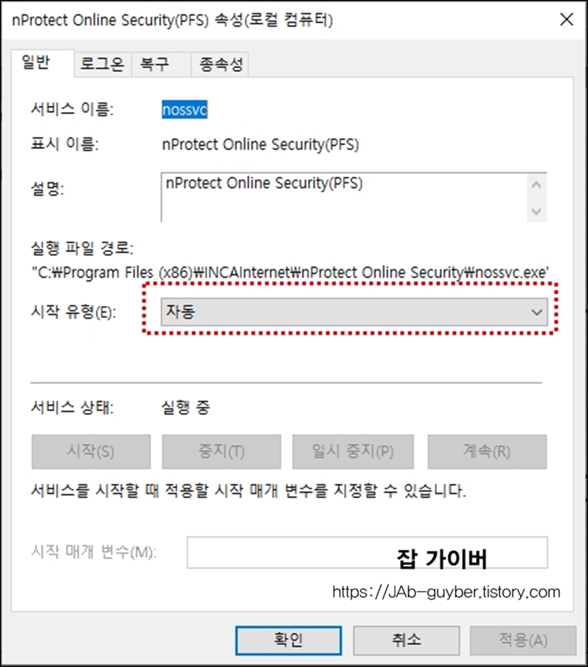 현재 nProtect 프로그램의 시작 유형이 자동으로 설정되어 있으며 이 부분을 수동으로 바꿔주면 됩니다.
