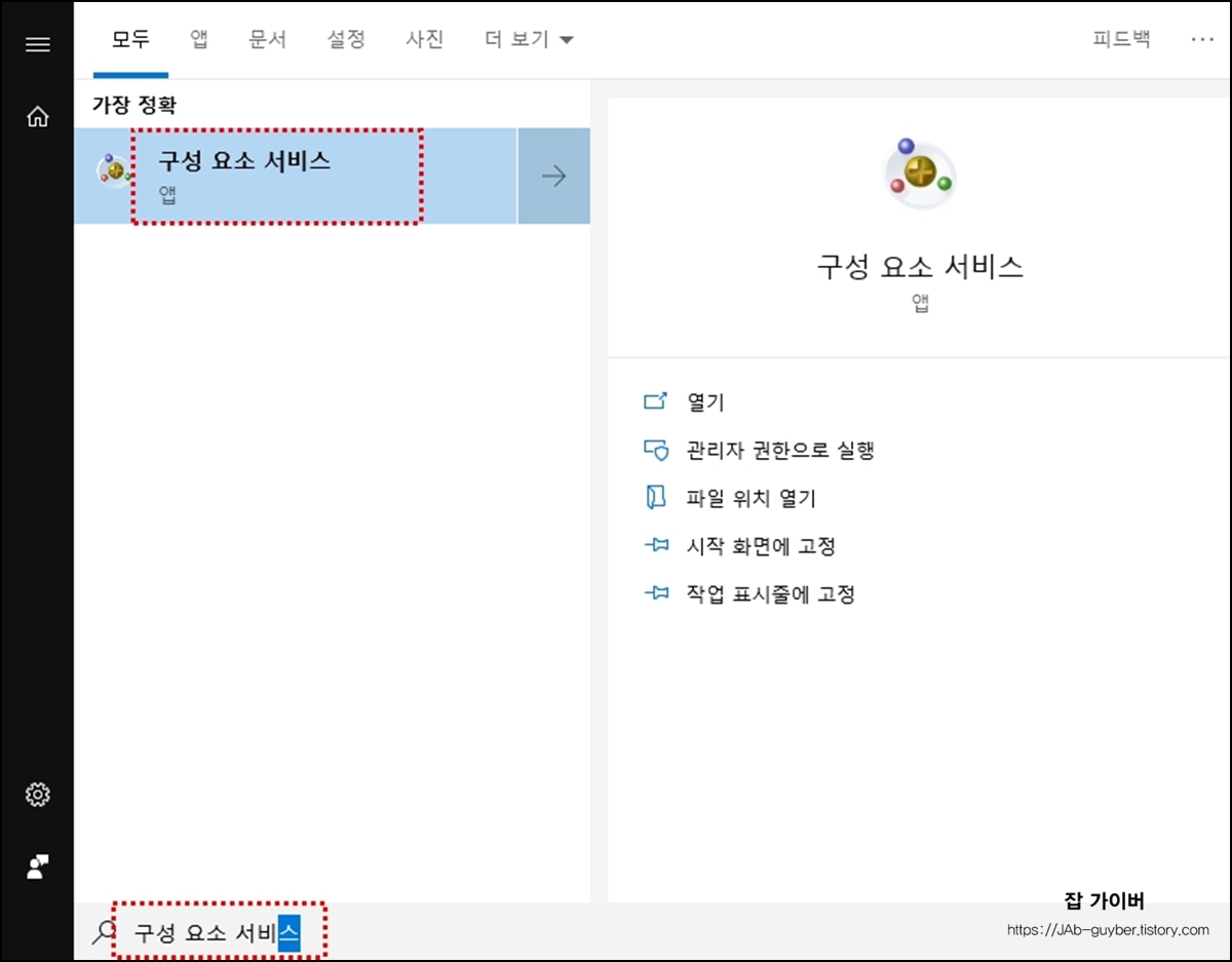 윈도우 시작 - 구성요소 서비스 클릭