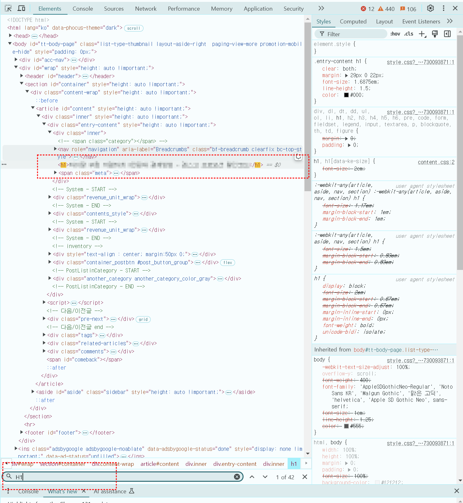 구글크롬으로 자신의 홈페이지에 접속 후 개발자 도구(F12)를 열고 HTML 코드에서 H1 태그를 검색하여, 페이지 내에 몇 개의 H1 태그가 있는지 확인합니다.