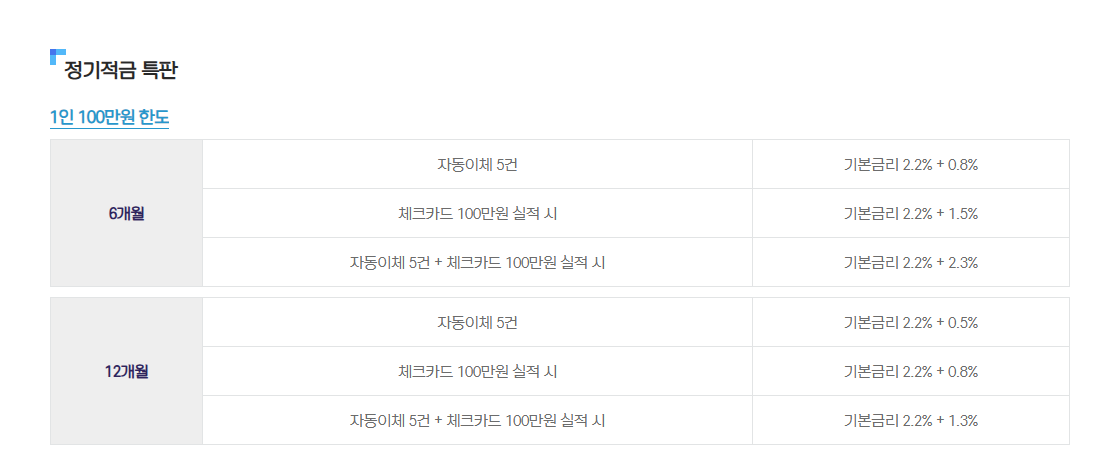 | 자동이체 5건 + 체크카드 100만원 실적 시 | 기본금리 2.2% + 1.3% |