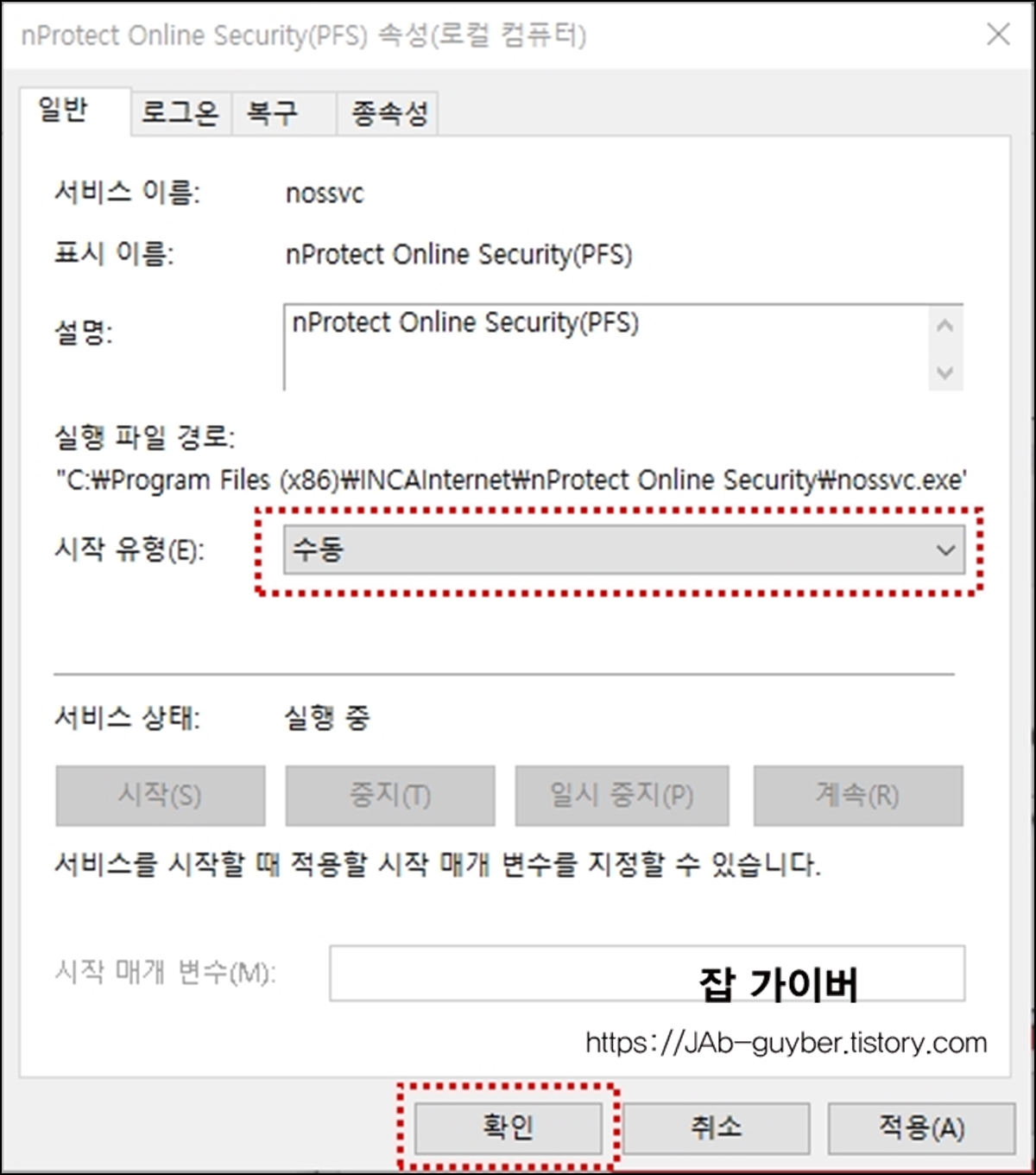 현재 nProtect 프로그램의 시작 유형이 자동으로 설정되어 있으며 이 부분을 수동으로 바꿔주면 됩니다.